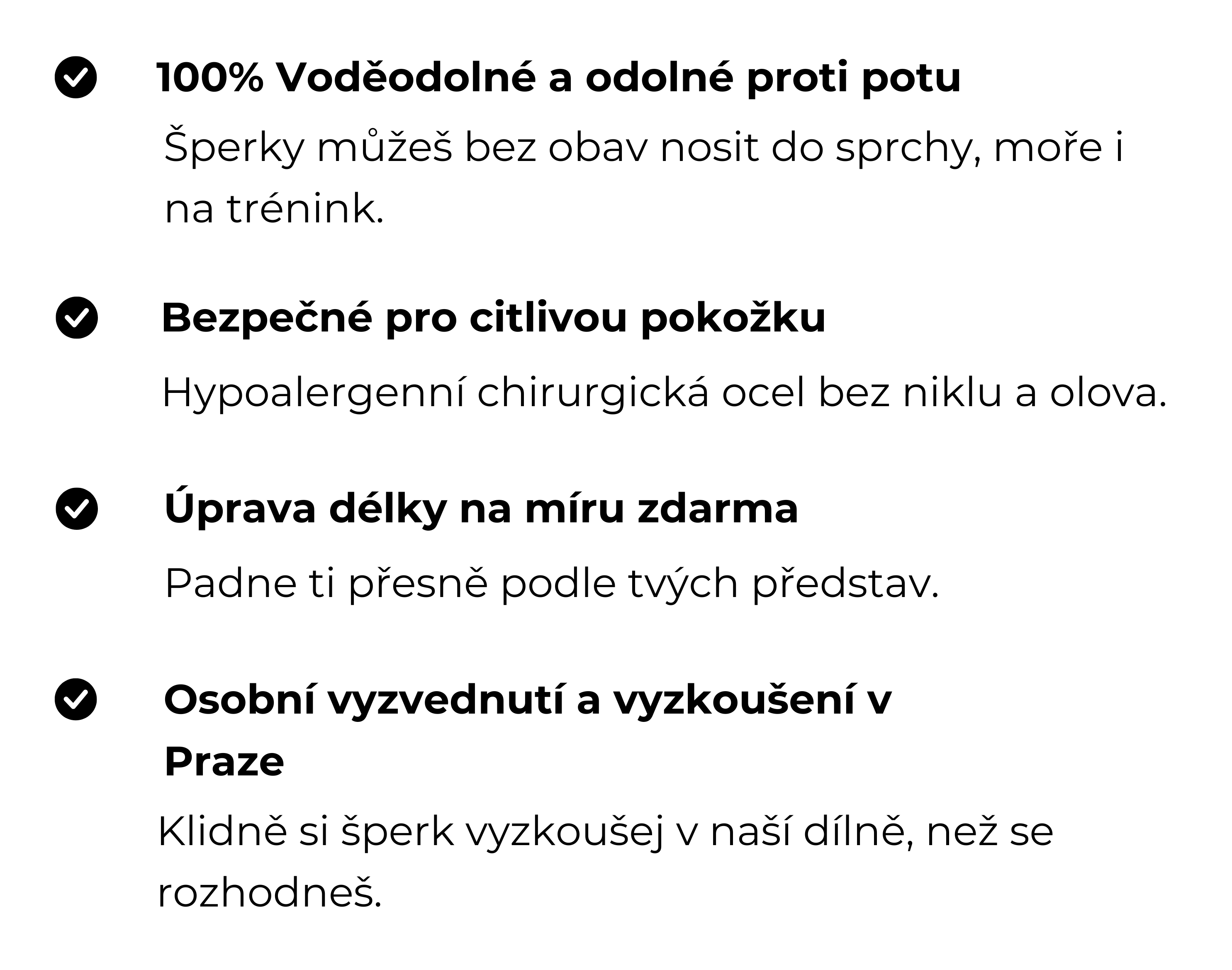 Temněř všechny šperky vyrábíme ručně v naší pražské dílně. Díky tomu vám můžeme nabídnout úpravy na míru – ať už jde o délku, velikost či jinou specifickou změnu. Máte konkrétní představu? Dejte nám vědět, rádi ji pro vás zrealizujeme.