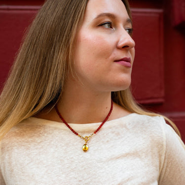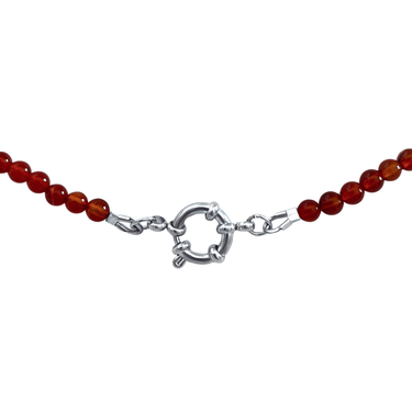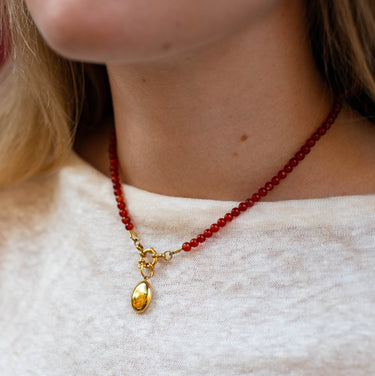 Tento náhrdelník z minerálu z červeného karneolu je ztělesněním jemnosti, elegance a ženské síly. Ručně vyrobený v České republice z kvalitních materiálů, v sobě spojuje přírodní drahokam rubín, symbol vášně a lásky, s minimalistickým designem, který se hodí ke každodennímu nošení i slavnostním příležitostem.