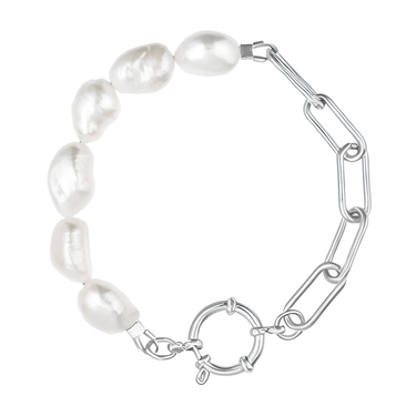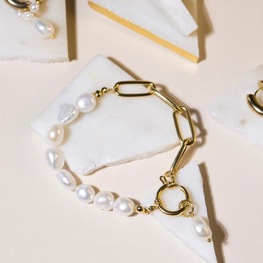 Náramek z pravých říčních perel v kombinaci s pozlaceným řetízkem z chirurgické oceli. Má karabinku kam můžete pověsit libovolný přívěsek z naší nabídky.