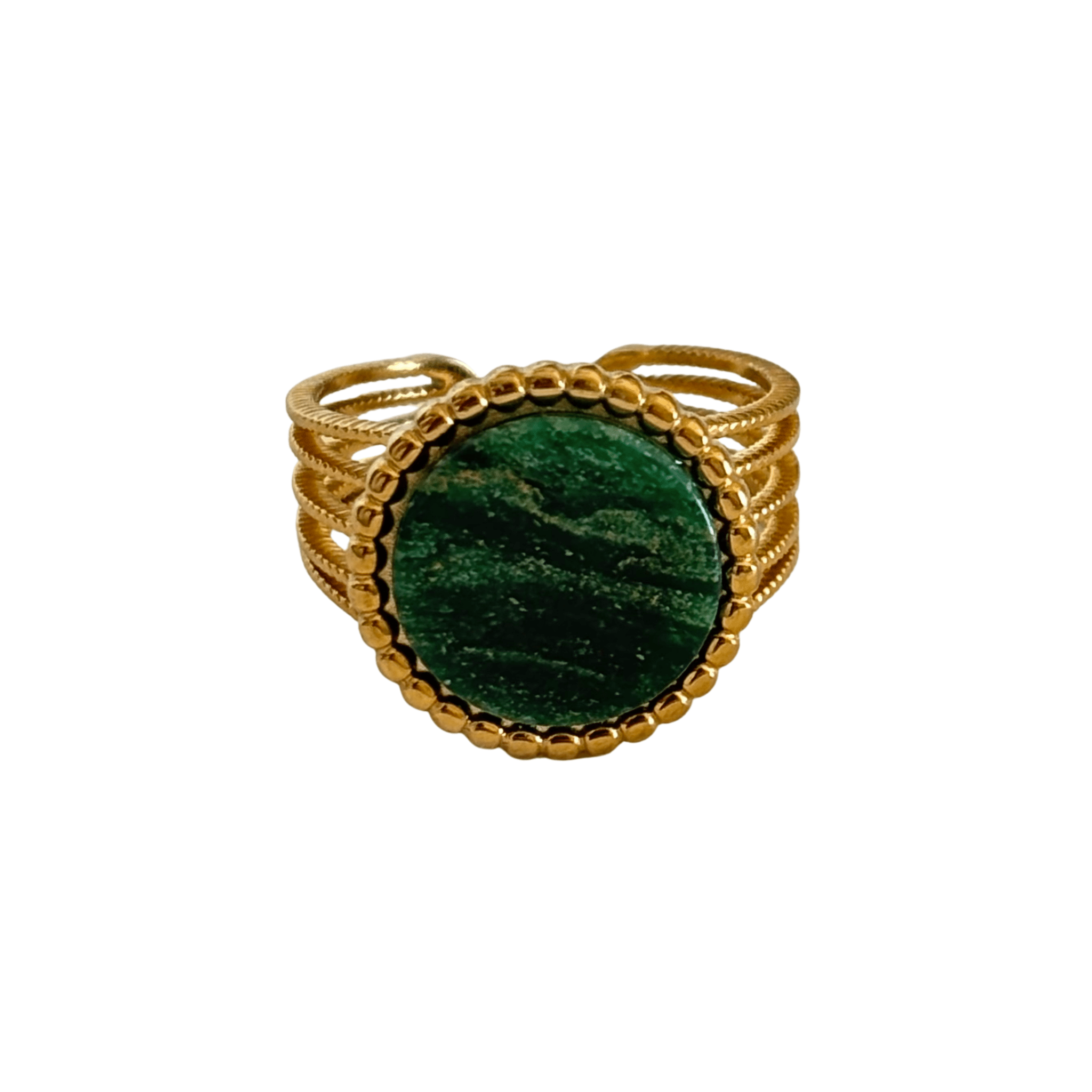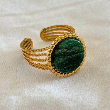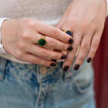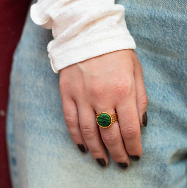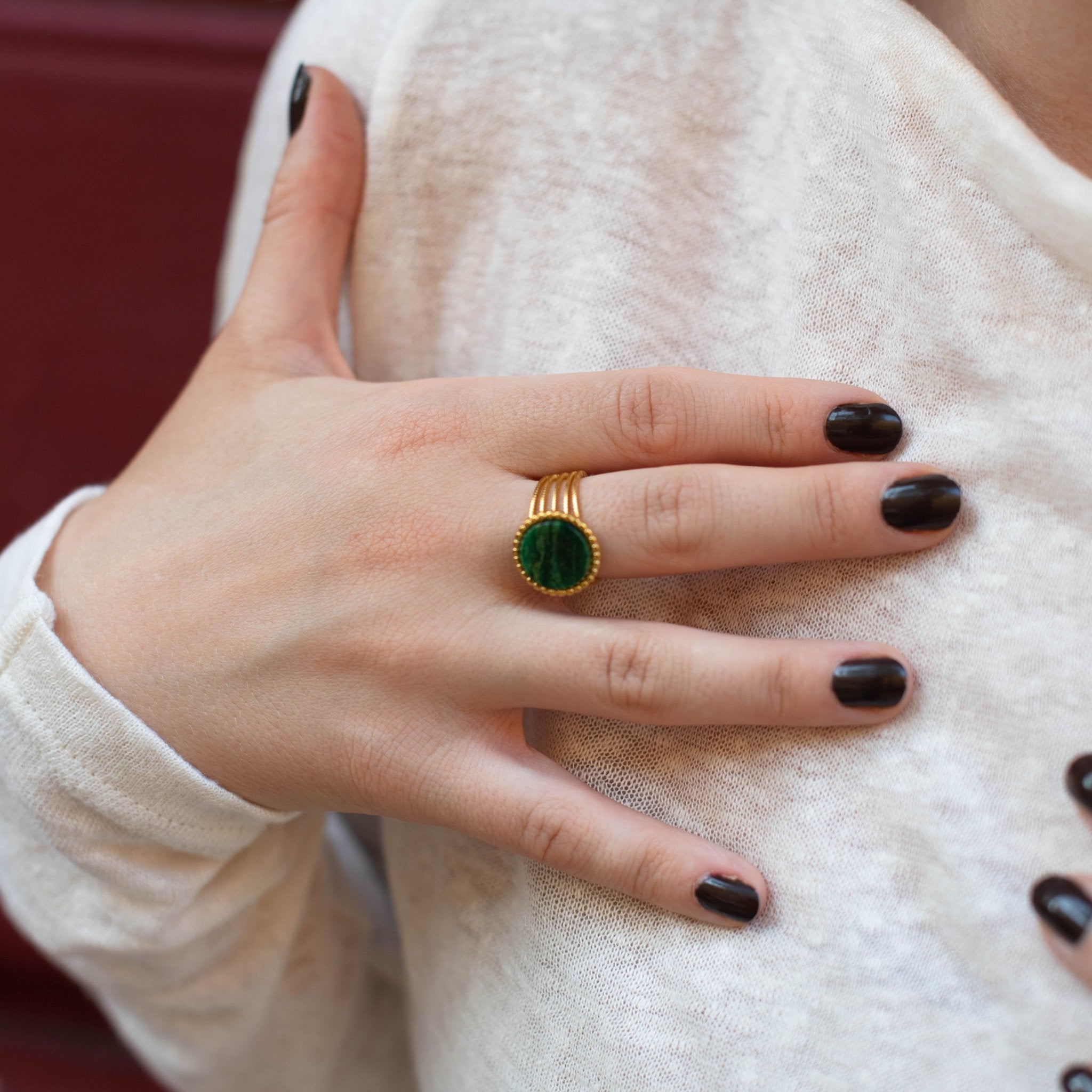 Tento široký otevřený prsten zdobí malachit – hluboký smaragdově zelený kámen se zcela jedinečnou kresbou vln a pruhů.