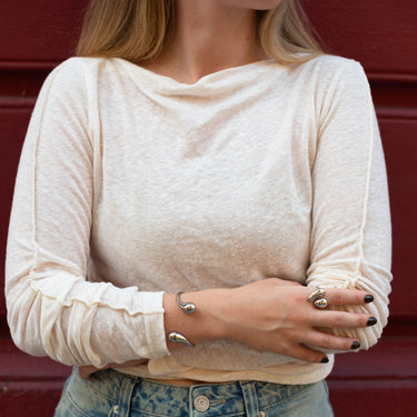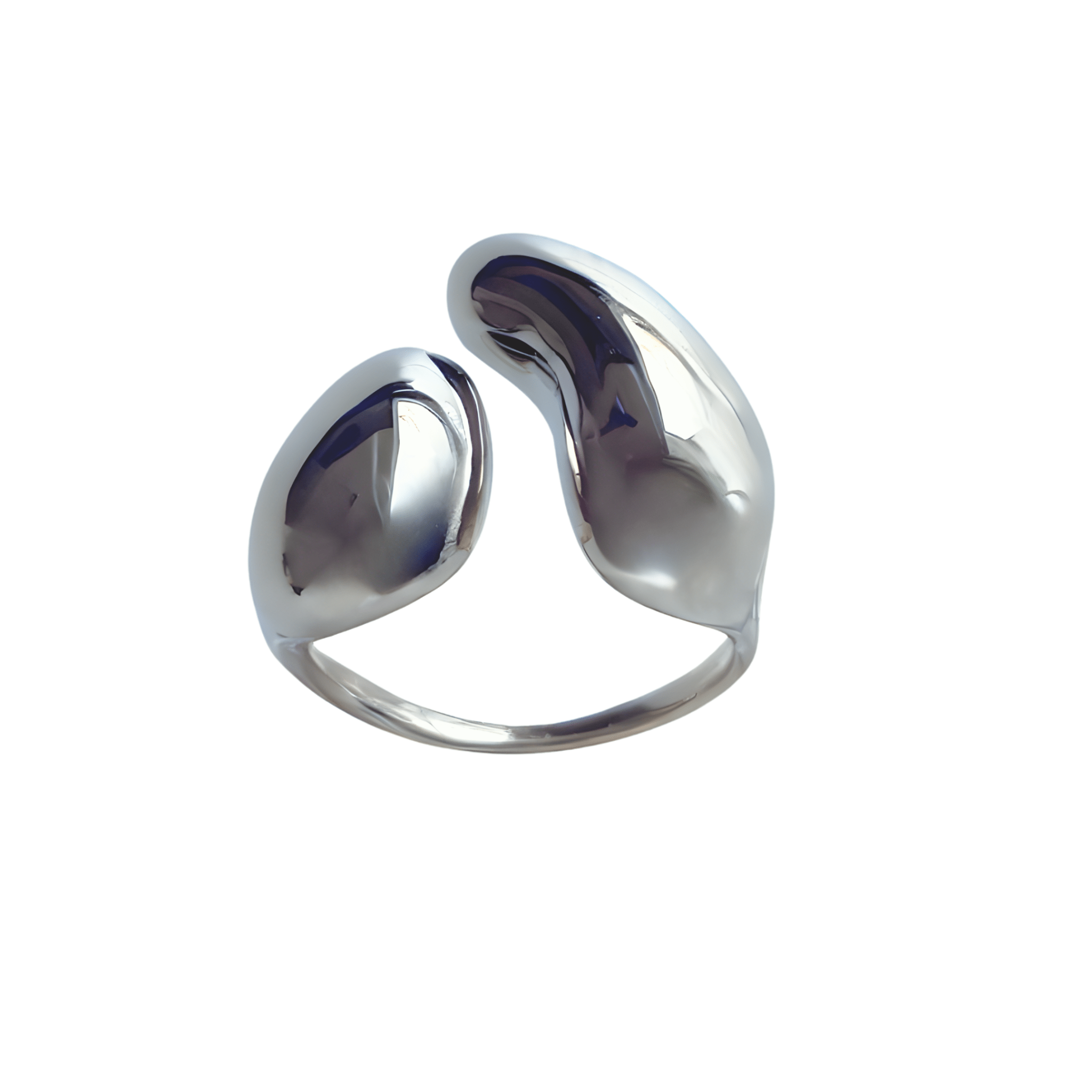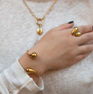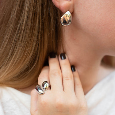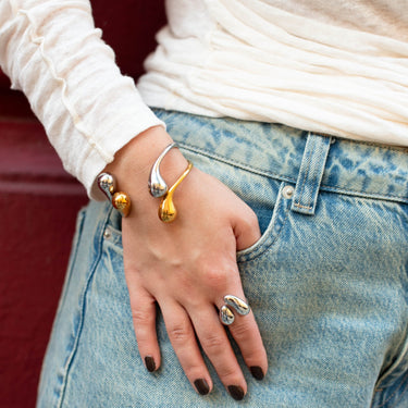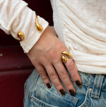 BOLD DROP je chunky prsten s tekutými liniemi a kapkovitými zakončeními, který vypadá jako odlitek kovu přímo na kůži.